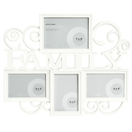 Brighten up your space and proudly showcase your favourite family photos in this stylish white frame. With room for one 7 x 5 inch (18 x 13cm) photo and four 6 x 4 inch (15x 10cm) photos of your choice, it is perfect for displaying a range of memories in elegant style. Fixings not included. Always read instructions.